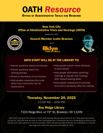 OATH staff were at the library to assist and educate people about what to do should they have received a summons and to check to determine if someone has an outstanding summons. Materials about remote hearings and other free resources were provided to the public as well.