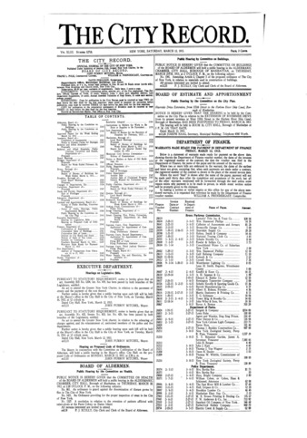 The City Record newspaper publishes notices which includes but is not limited to: public hearings and meetings, public auctions and sales, solicitations and awards and official rules proposed and adopted by city agencies. This is the City Record Newspaper for March 13, 1915.