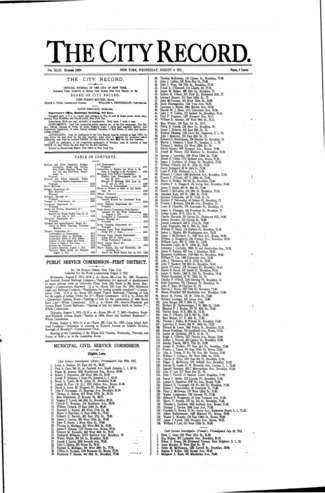 The City Record newspaper publishes notices which includes but is not limited to: public hearings and meetings, public auctions and sales, solicitations and awards and official rules proposed and adopted by city agencies. This is the City Record Newspaper for August 04, 1915.