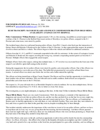 Mayor's Press Release: MAYOR DE BLASIO AND POLICE COMMISSIONER BRATTON HOLD MEDIA AVAILABILITY AT KINGS COUNTY HOSPITAL