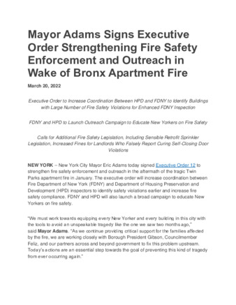 Mayor Adams Signs Executive Order Strengthening Fire Safety Enforcement and Outreach in Wake of Bronx Apartment Fire