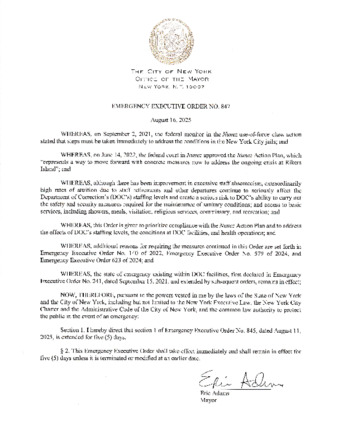 Emergency Executive Order No. 847, is being submitted to extend Emergency Executive Order No. 845, dated August 11, 2025; for five (5) days as it relates to Rikers.