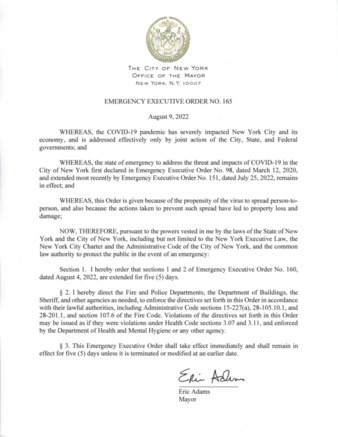 Emergency Executive Order No. 165, extends Emergency Executive Order No. 160, dated August 4th, 2022, for five (5) days, if this relates to Covid-19 pandemic.