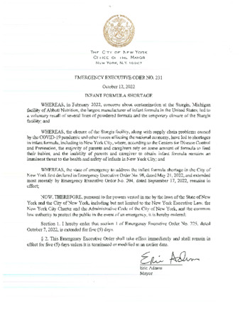 Emergency Executive Order No. 231, will extend Emergency Executive Order No. 225, dated October 7, 2022, for five (5) days, if this relates to Infant Formula Shortage.