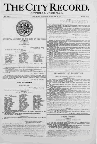 The City Record newspaper publishes notices which includes but is not limited to: public hearings and meetings, public auctions and sales, solicitations and awards and official rules proposed and adopted by city agencies. This is the City Record Newspaper for February 28, 1901.