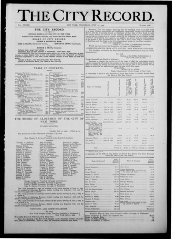 The City Record newspaper publishes notices which includes but is not limited to: public hearings and meetings, public auctions and sales, solicitations and awards and official rules proposed and adopted by city agencies. This is the City Record Newspaper for July 13, 1905.
