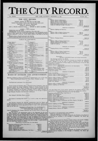 The City Record newspaper publishes notices which includes but is not limited to: public hearings and meetings, public auctions and sales, solicitations and awards and official rules proposed and adopted by city agencies. This is the City Record Newspaper for December 23, 1905.