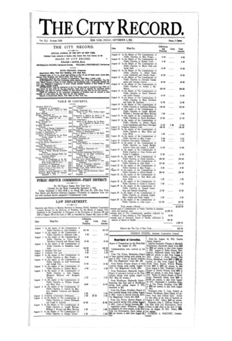 The City Record newspaper publishes notices which includes but is not limited to: public hearings and meetings, public auctions and sales, solicitations and awards and official rules proposed and adopted by city agencies. This is the City Record Newspaper for September 05, 1913.