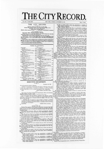 The City Record newspaper publishes notices which includes but is not limited to: public hearings and meetings, public auctions and sales, solicitations and awards and official rules proposed and adopted by city agencies. This is the City Record Newspaper for November 10, 1914.