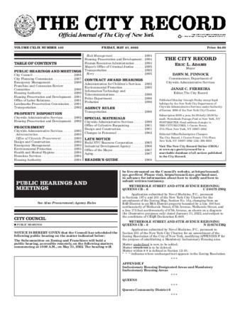 The City Record newspaper publishes notices which includes but is not limited to public hearings and meetings, public auctions and sales, solicitations and awards and official rules proposed and adopted by city agencies.