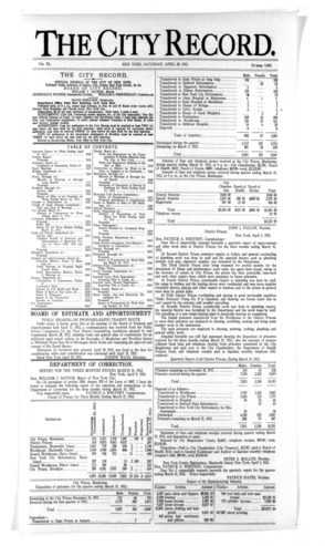 The City Record newspaper publishes notices which includes but is not limited to: public hearings and meetings, public auctions and sales, solicitations and awards and official rules proposed and adopted by city agencies. This is the City Record Newspaper for April 20, 1912.