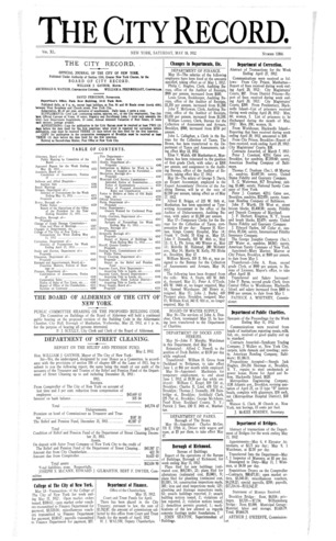 The City Record newspaper publishes notices which includes but is not limited to: public hearings and meetings, public auctions and sales, solicitations and awards and official rules proposed and adopted by city agencies. This is the City Record Newspaper for May 18, 1912.
