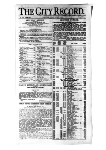The City Record newspaper publishes notices which includes but is not limited to: public hearings and meetings, public auctions and sales, solicitations and awards and official rules proposed and adopted by city agencies. This is the City Record Newspaper for October 13, 1914.