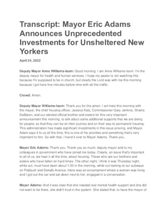 Transcript: Mayor Eric Adams Announces Unprecedented Investments for Unsheltered New Yorkers