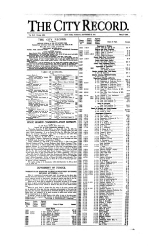 The City Record newspaper publishes notices which includes but is not limited to: public hearings and meetings, public auctions and sales, solicitations and awards and official rules proposed and adopted by city agencies. This is the City Record Newspaper for September 08, 1914.