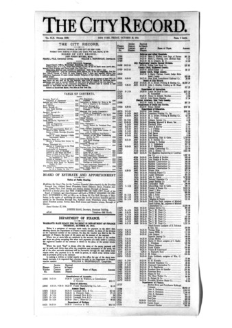 The City Record newspaper publishes notices which includes but is not limited to: public hearings and meetings, public auctions and sales, solicitations and awards and official rules proposed and adopted by city agencies. This is the City Record Newspaper for October 30, 1914.