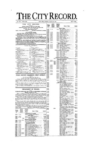 The City Record newspaper publishes notices which includes but is not limited to: public hearings and meetings, public auctions and sales, solicitations and awards and official rules proposed and adopted by city agencies. This is the City Record Newspaper for August 25, 1914.