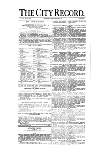 The City Record newspaper publishes notices which includes but is not limited to: public hearings and meetings, public auctions and sales, solicitations and awards and official rules proposed and adopted by city agencies. This is the City Record Newspaper for March 11, 1916.