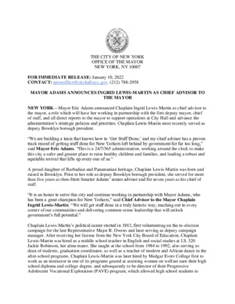 MAYOR ADAMS ANNOUNCES INGRID LEWIS-MARTIN AS CHIEF ADVISOR TO THE MAYOR