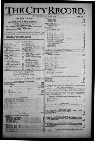 The City Record newspaper publishes notices which includes but is not limited to: public hearings and meetings, public auctions and sales, solicitations and awards and official rules proposed and adopted by city agencies. This is the City Record Newspaper for September 17, 1906.
