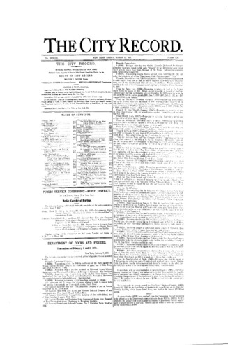The City Record newspaper publishes notices which includes but is not limited to: public hearings and meetings, public auctions and sales, solicitations and awards and official rules proposed and adopted by city agencies. This is the City Record Newspaper for March 11, 1910.