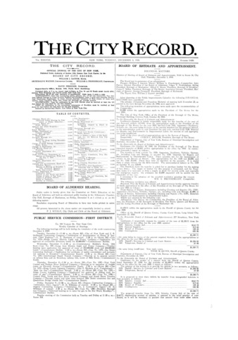 The City Record newspaper publishes notices which includes but is not limited to: public hearings and meetings, public auctions and sales, solicitations and awards and official rules proposed and adopted by city agencies. This is the City Record Newspaper for December 06, 1910.