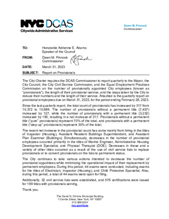 The City Charter requires the DCAS Commissioner to report quarterly to the Mayor, the City Council, the City Civil Service Commission, and the Equal Employment Practices Commission on the number of provisionally appointed City employees (known as “Provisionals”),