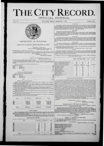 The City Record newspaper publishes notices which includes but is not limited to: public hearings and meetings, public auctions and sales, solicitations and awards and official rules proposed and adopted by city agencies. This is the City Record Newspaper for February 01, 1878.