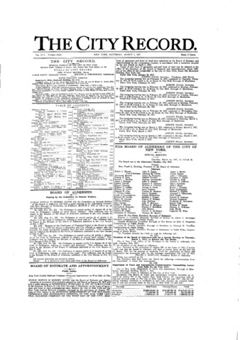 The City Record newspaper publishes notices which includes but is not limited to: public hearings and meetings, public auctions and sales, solicitations and awards and official rules proposed and adopted by city agencies. This is the City Record Newspaper for March 03, 1917.