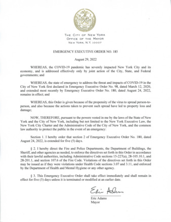 Emergency Executive Order No. 185, extends Emergency Executive Order No. 180, dated August 24, 2022, for five (5) days, if this relates to COVID-19 pandemic.