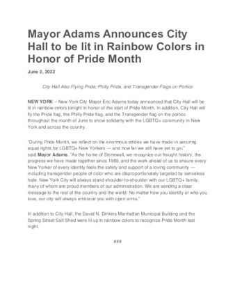 Mayor Adams Announces City Hall to be lit in Rainbow Colors in Honor of Pride Month