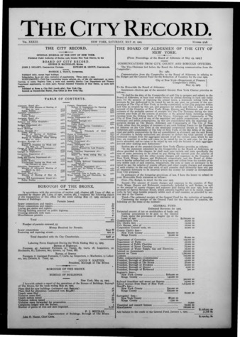 The City Record newspaper publishes notices which includes but is not limited to: public hearings and meetings, public auctions and sales, solicitations and awards and official rules proposed and adopted by city agencies. This is the City Record Newspaper for May 27, 1905.