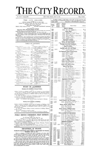 The City Record newspaper publishes notices which includes but is not limited to: public hearings and meetings, public auctions and sales, solicitations and awards and official rules proposed and adopted by city agencies. This is the City Record Newspaper for May 21, 1915.