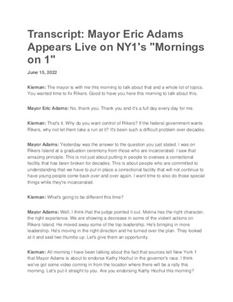 A transcript about New York City Mayor Eric Adams appearing live on NY1's "Mornings on 1," discussing a variety of topics including the Rikers Island situation, affordable housing, and marijuana.