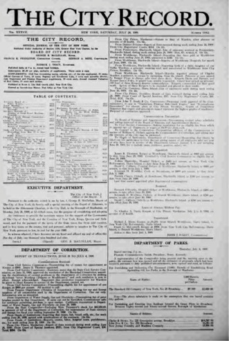 The City Record newspaper publishes notices which includes but is not limited to: public hearings and meetings, public auctions and sales, solicitations and awards and official rules proposed and adopted by city agencies. This is the City Record Newspaper for July 24, 1909.