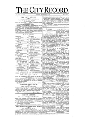 The City Record newspaper publishes notices which includes but is not limited to: public hearings and meetings, public auctions and sales, solicitations and awards and official rules proposed and adopted by city agencies. This is the City Record Newspaper for March 05, 1915.