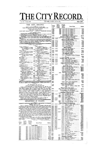 The City Record newspaper publishes notices which includes but is not limited to: public hearings and meetings, public auctions and sales, solicitations and awards and official rules proposed and adopted by city agencies. This is the City Record Newspaper for July 24, 1917.