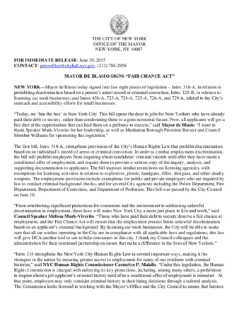 Mayor's Press Release: MAYOR DE BLASIO SIGNS “FAIR CHANCE ACT”