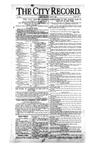 The City Record newspaper publishes notices which includes but is not limited to: public hearings and meetings, public auctions and sales, solicitations and awards and official rules proposed and adopted by city agencies. This is the City Record Newspaper for March 01, 1912.