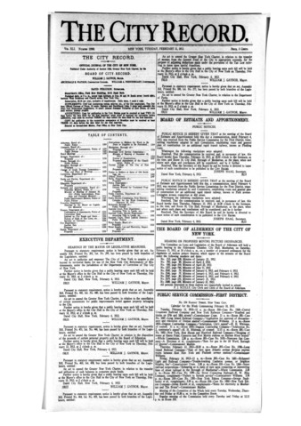 The City Record newspaper publishes notices which includes but is not limited to: public hearings and meetings, public auctions and sales, solicitations and awards and official rules proposed and adopted by city agencies. This is the City Record Newspaper for February 11, 1913.