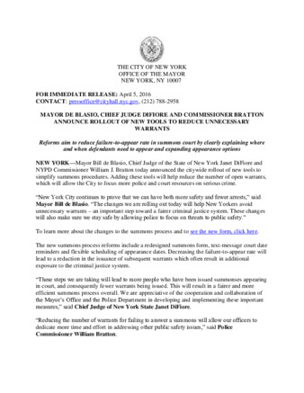 Mayor's Press Release: MAYOR DE BLASIO, CHIEF JUDGE DIFIORE AND COMMISSIONER BRATTON ANNOUNCE ROLLOUT OF NEW TOOLS TO REDUCE UNNECESSARY WARRANTS