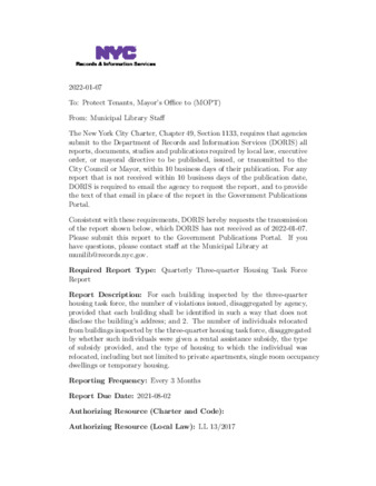 For each building inspected by the three-quarter housing task force, the number of violations issued, disaggregated by agency, provided that each building shall be identified in such a way that does not disclose the building's address; and 2. The number of individuals relocated from buildings inspected by the three-quarter housing task force, disaggregated by whether such individuals were given a rental assistance subsidy, the type of subsidy provided, and the type of housing to which the individual was relocated, including but not limited to private apartments, single room occupancy dwellings or temporary housing.