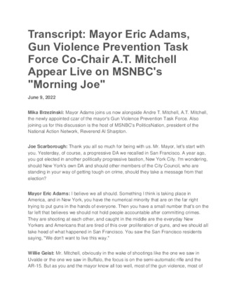 A transcript about New York City Mayor Eric Adams and Co-Chair of the Gun Violence Prevention Task Force A.T. Mitchell appearing live on MSNBC's "Morning Joe."