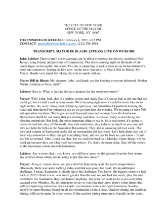 Mayor's Press Release: MAYOR DE BLASIO APPEARS LIVE ON WCBS 880