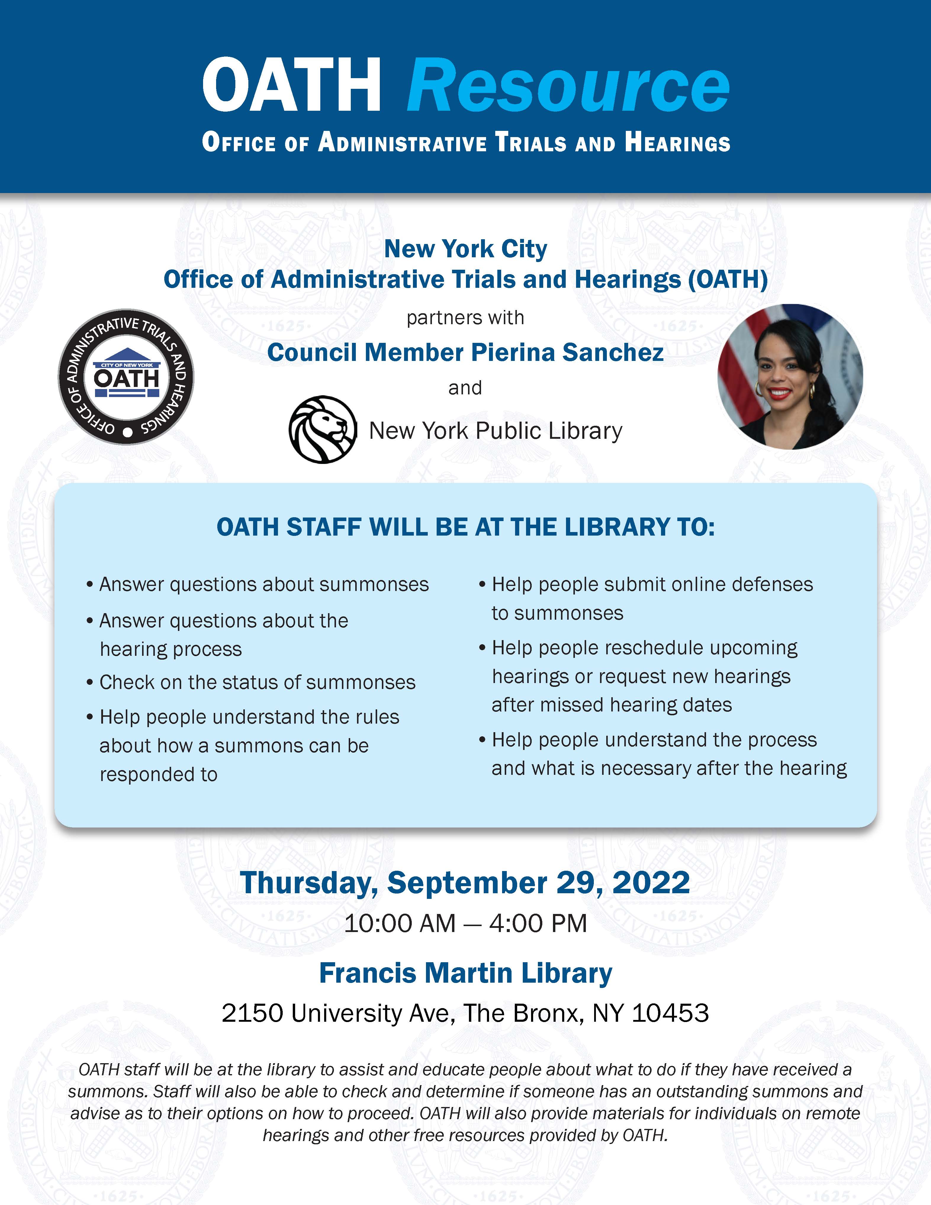 OATH staff were at the library to assist and educate people about what to do should they have received a summons and to check to determine if someone has an outstanding summons. Materials about remote hearings and other free resources were provided to the public as well.