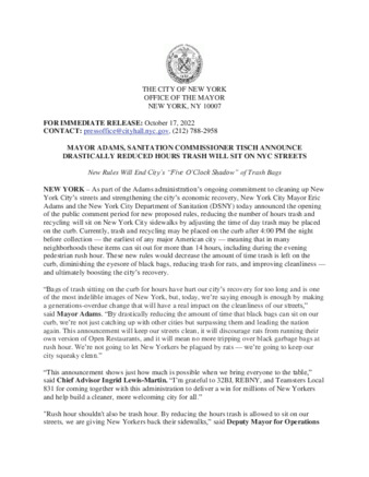 New York City Mayor Eric Adams and the New York City Department of Sanitation (DSNY) announces the opening of the public comment period for new proposed rules, reducing the number of hours trash and recycling.