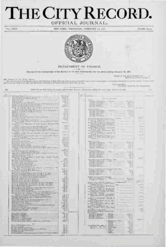 The City Record newspaper publishes notices which includes but is not limited to: public hearings and meetings, public auctions and sales, solicitations and awards and official rules proposed and adopted by city agencies. This is the City Record Newspaper for February 20, 1901.