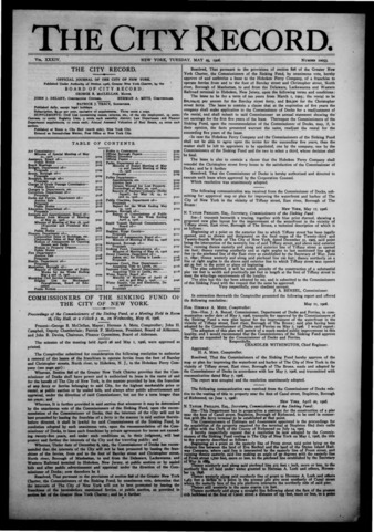 The City Record newspaper publishes notices which includes but is not limited to: public hearings and meetings, public auctions and sales, solicitations and awards and official rules proposed and adopted by city agencies. This is the City Record Newspaper for May 29, 1906.