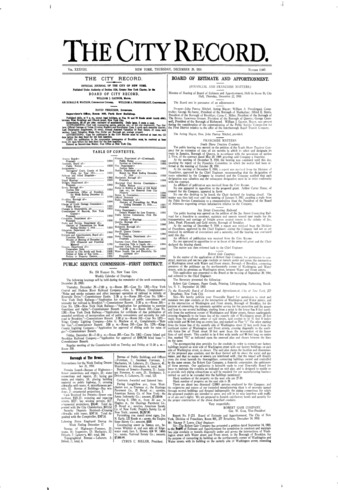 The City Record newspaper publishes notices which includes but is not limited to: public hearings and meetings, public auctions and sales, solicitations and awards and official rules proposed and adopted by city agencies. This is the City Record Newspaper for December 29, 1910.