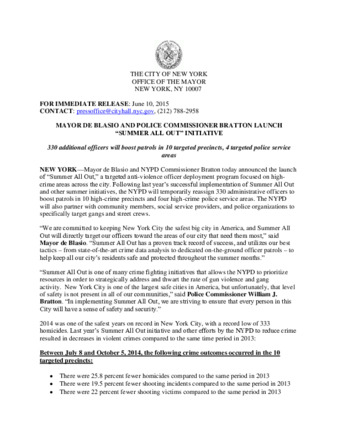 Mayor's Press Release: MAYOR DE BLASIO AND POLICE COMMISSIONER BRATTON LAUNCH “SUMMER ALL OUT” INITIATIVE
